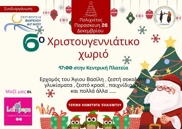 Καλά θα πάει κι αυτό! Μια μέρα μετά τα Χριστούγεννα σας περιμένουμε στην πλατεία του Πολιχνίτου! Ο Άγιος Βασίλης έρχεται και στο χωριό μας να μοιράσει δώρα στα παιδιά!