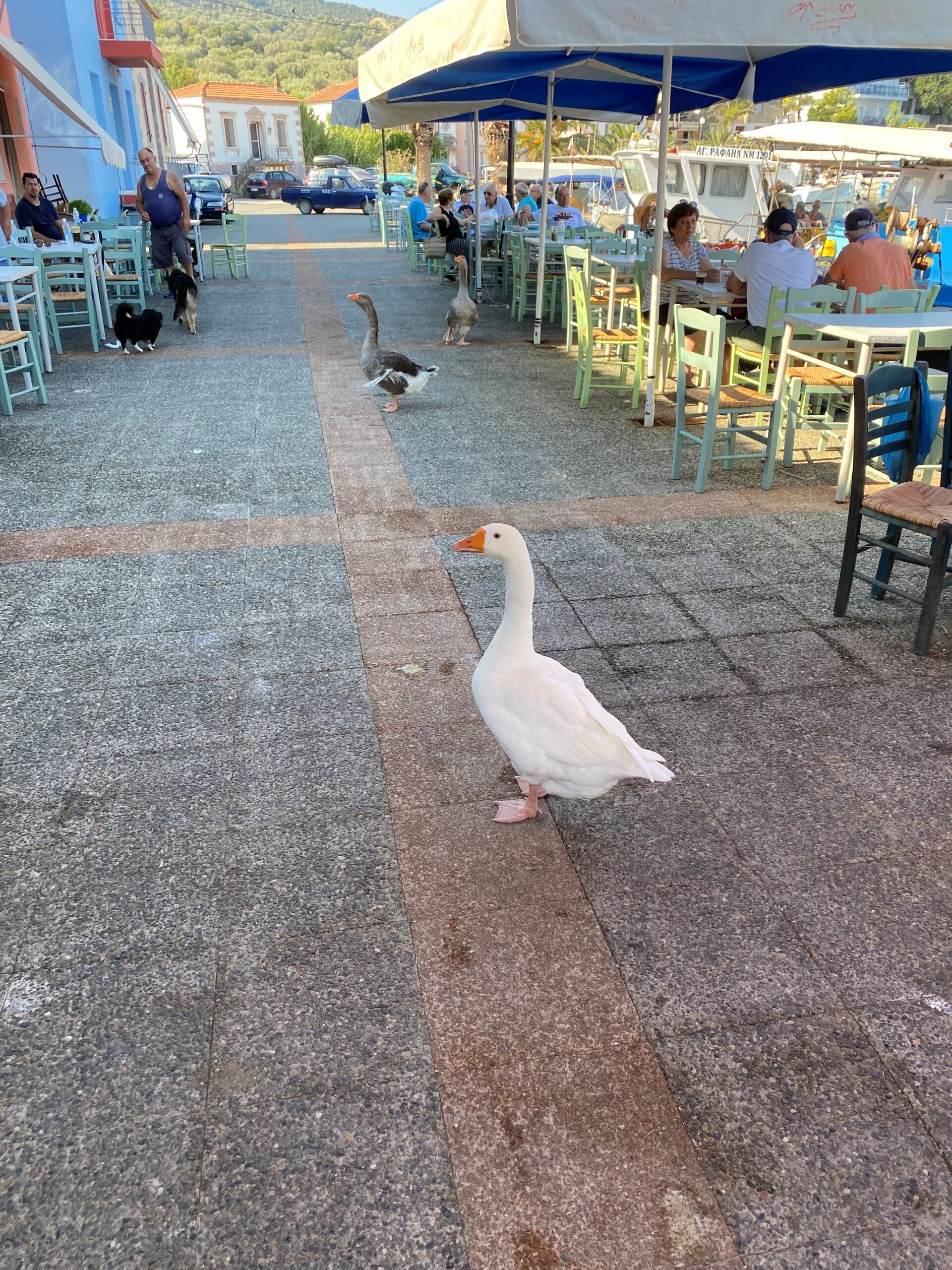 Θαρραλέες, αποφασιστικές, καμαρωτές, πλήρως κοινωνικοποιημένες, με στεντόρεια φωνή, απαιτούν να τις ακούσεις. Επιβάλλονται με τον τρόπο τους οι χήνες της Σκάλας, που παίρνουν τον πρωινό τους περίπατο. Μέρος του παραθαλάσσιου σκηνικού πια. Άνθρωποι και ζωντανά αντάμα χαίρονται και απολαμβάνουν την ομορφιά. Μάλλον κάτι θα λένε στη γλώσσα τους έτσι αυστηρά που κοιτάζουν αλλά ας το αφήσουμε. Είναι και ο νόμος περί Τύπου…