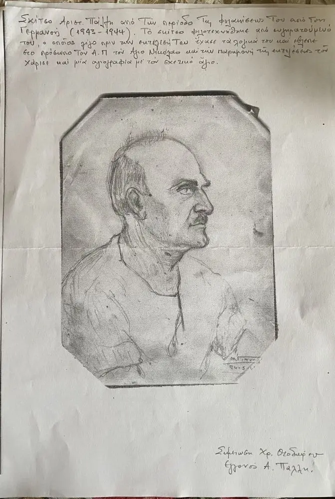 Η σημείωση του εγγονού Χρήστου Θεωδώρου τρμακτική, Γράφει: “Σκίτσο του Αριστείδη Πάλλη κατά την περίοδο της φυλάκισής του από τους Γερμανούς (1943 1944). Το σκίτσο φιλοτεχνήθηκε από συγκρατούμενό του, ο οποίος λίγο πριν την εκτέλεσή έχασε του λογικά του και έβλεπε στο πρόσωπο του Αριστείδη Πάλλη τον Άγιο Νικόλαο την παραμονή της εκτελέσεως του χάρισε και μια αγιογραφία για τον σχετικό άγιο.:”