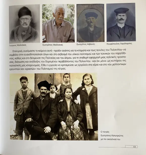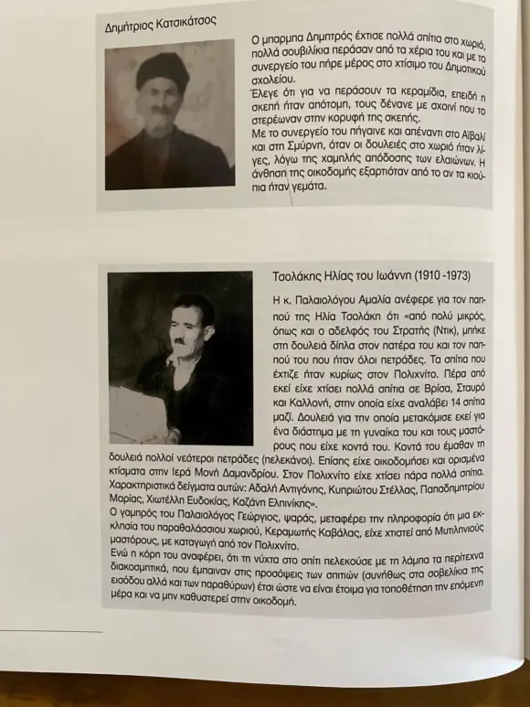 Αυτή τη φορά, στο βιβλίο που μόλις κυκλοφόρησε, την ιστορία του τόπου μας τη γράφουν λαϊκοί μαστόροι, που με το μόχθο και την τέχνη τους κατασκεύασαν, μάλλον σμίλεψαν και φιλοτέχνησαν το αληθινό μουσείο μας, τον Πολιχνίτο. Ένα βιβλίο θησαυρός, που αποθησαυρίζει μεθοδικά και επιστημονικά ένα μεγάλο μέρος του πολιτισμού μας.
