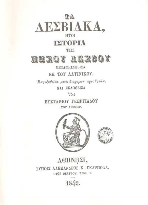Το 1849 παρακινείται από το βιβλίο του Γερμανού Plehn (Πλίνιος) μαθαίνει Λατινικά στα 45 του και το μεταφράζει στα Ελληνικά. Μαζεύει συνδρομές από Έλληνες εντός και εκτός Λέσβου και από Έλληνες στο εξωτερικό, και κυκλοφορεί το βιβλίο *ΤΑ ΛΕΣΒΙΑΚΑ* στην οθωμανοκρατούμενη Λέσβο. Επανεκδίδεται το 1973 από τον δισέγγονό του γιατρό- μαιευτήρα Μάϊστρο Σάββα. Στους προλόγους της επανέκδοσης δεν αναφέρεται η γνώμη ότι συγγραφέας είναι ο Ευστάθιος και μεταχειρίστηκε τις πληροφορίες του Πλεν τις οποίες και μετέφρασε από μετριοφροσύνη που τον χαρακτήριζε.
